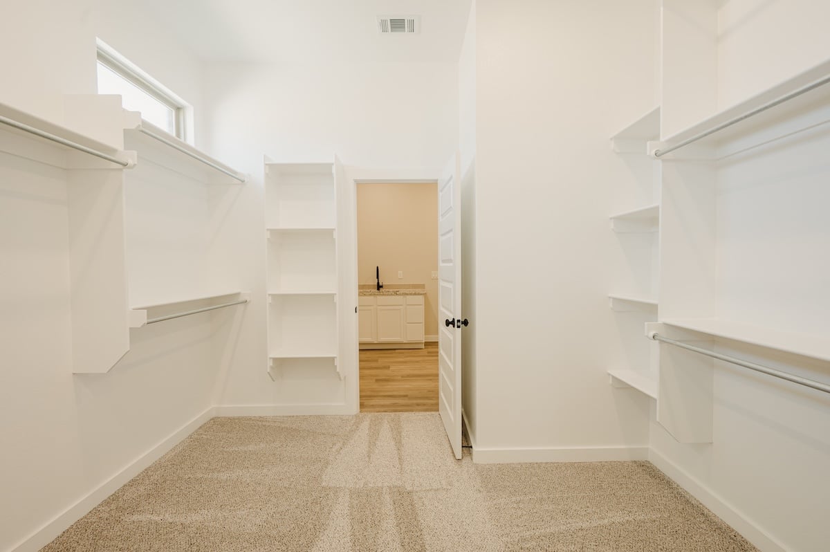 - Secluded master suite with garden tub, walk-in shower, his and hers vanities, and oversized walk-in closet with utility room access