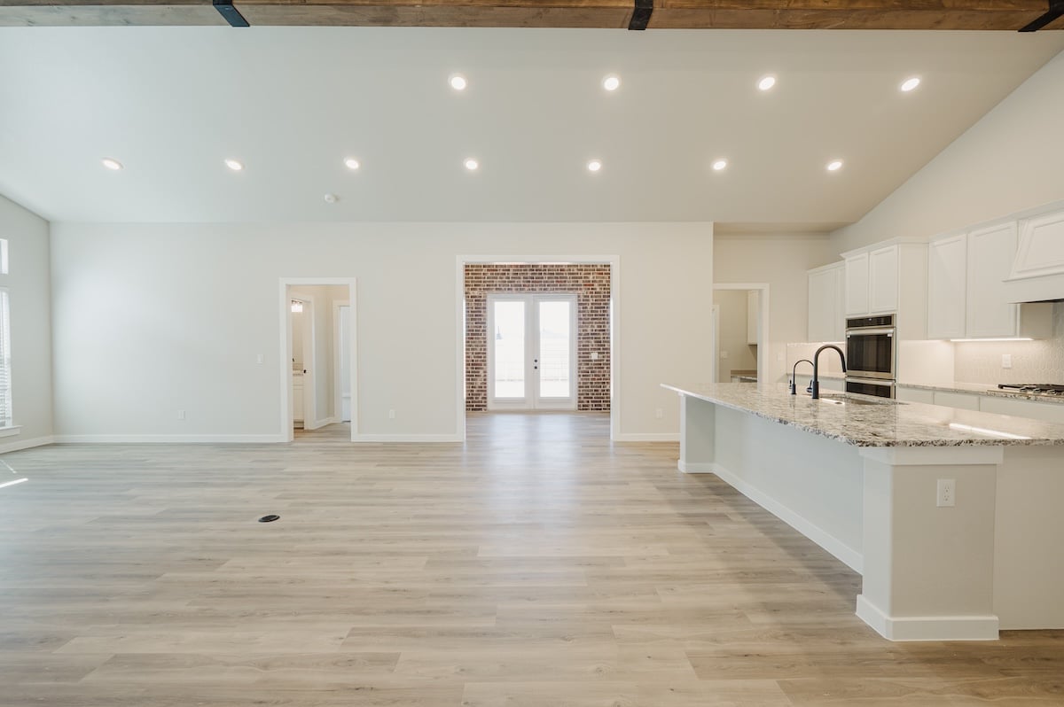- Open-concept kitchen, living, and dining area