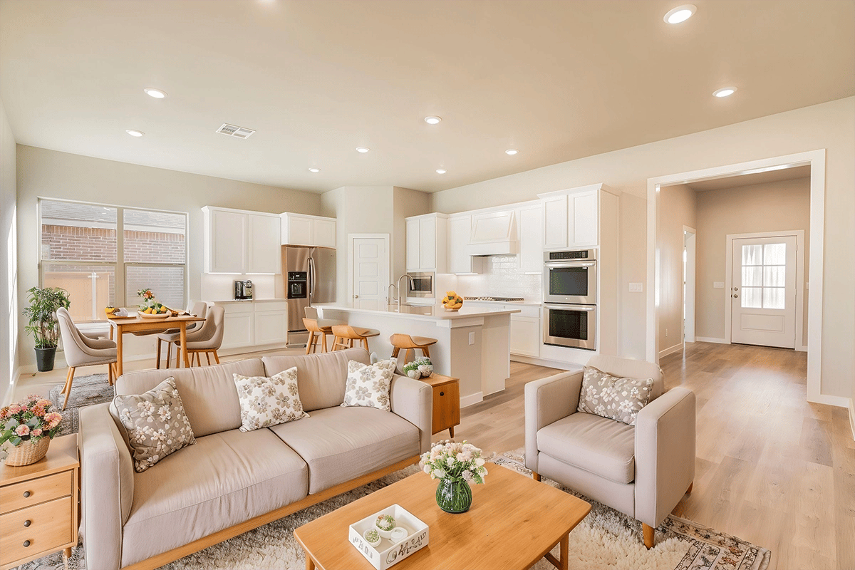 - Open-concept kitchen, living, and dining area