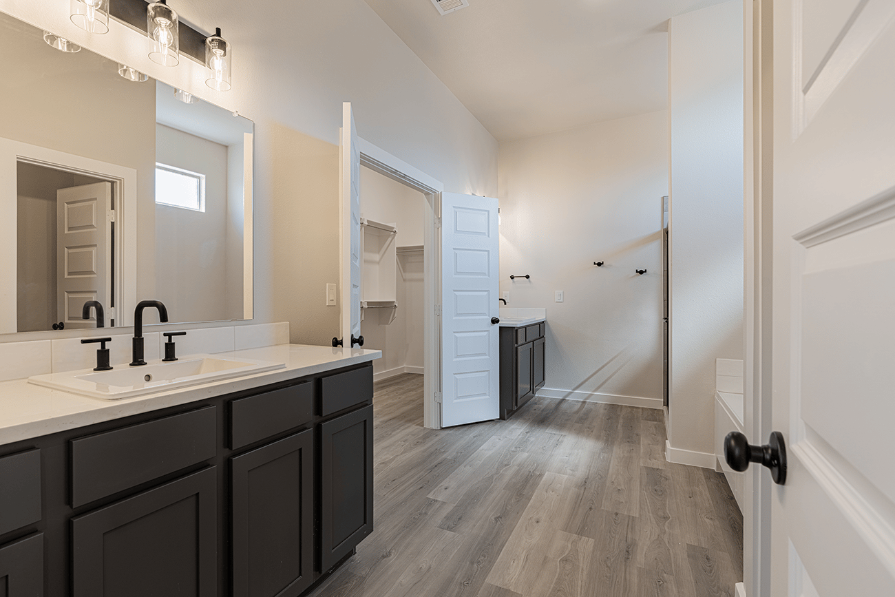 - Secluded master suite with garden tub, walk-in shower, his and hers vanities, and oversized walk-in closet