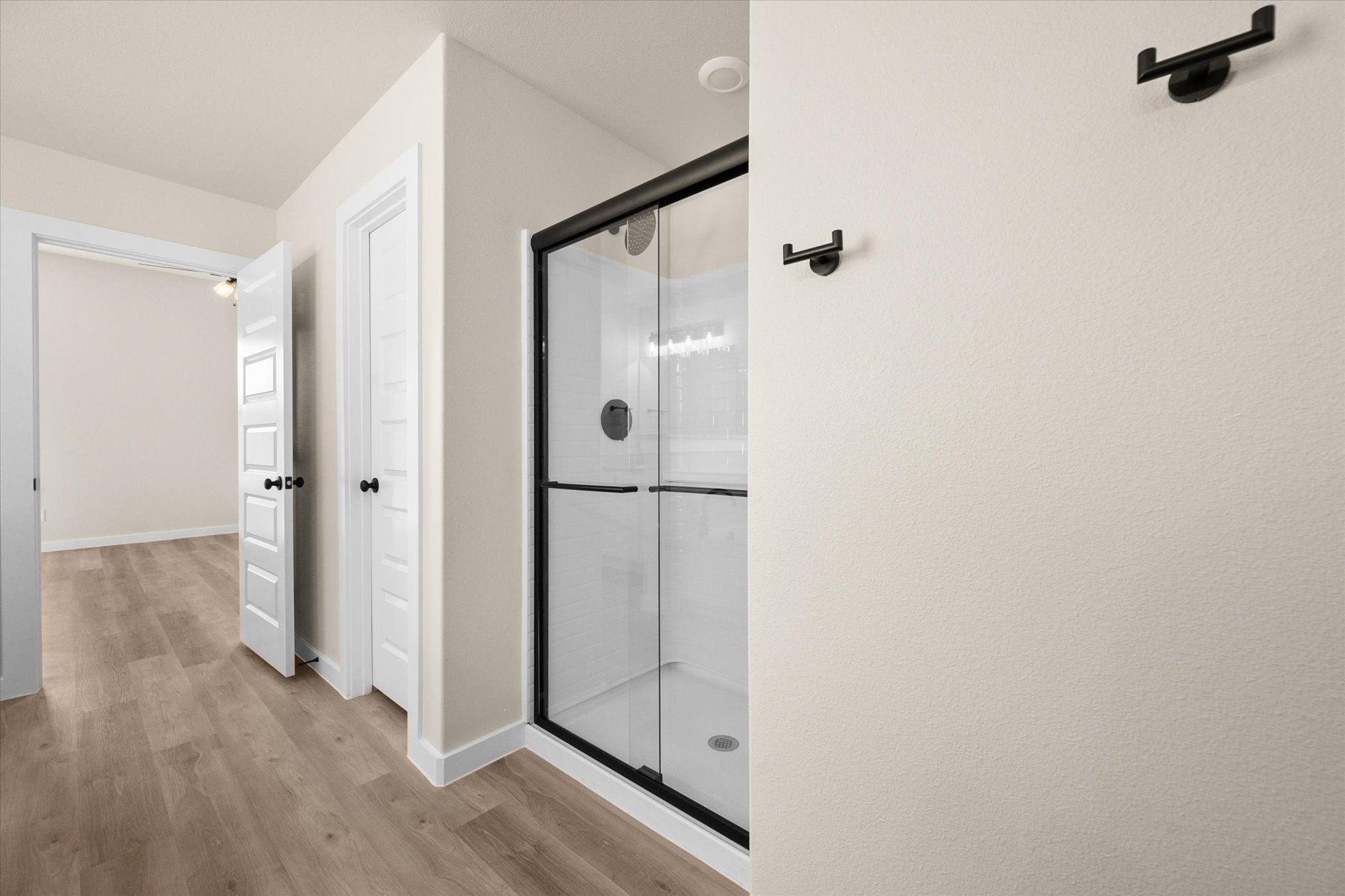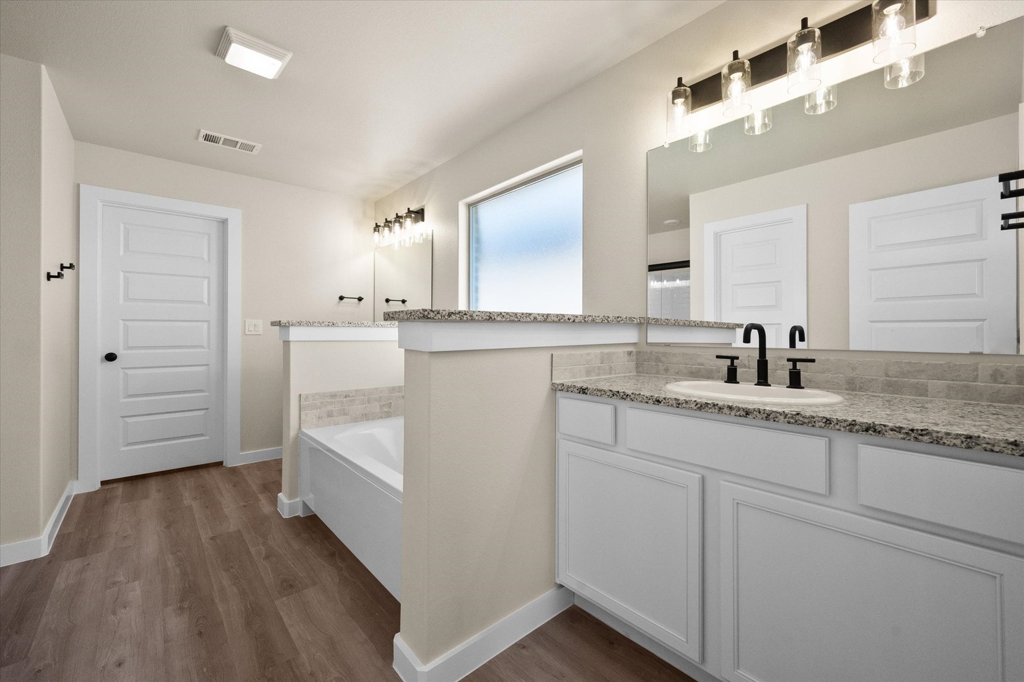 - Secluded master suite with drop-in tub, walk-in shower, his and hers vanities, and walk-in closet