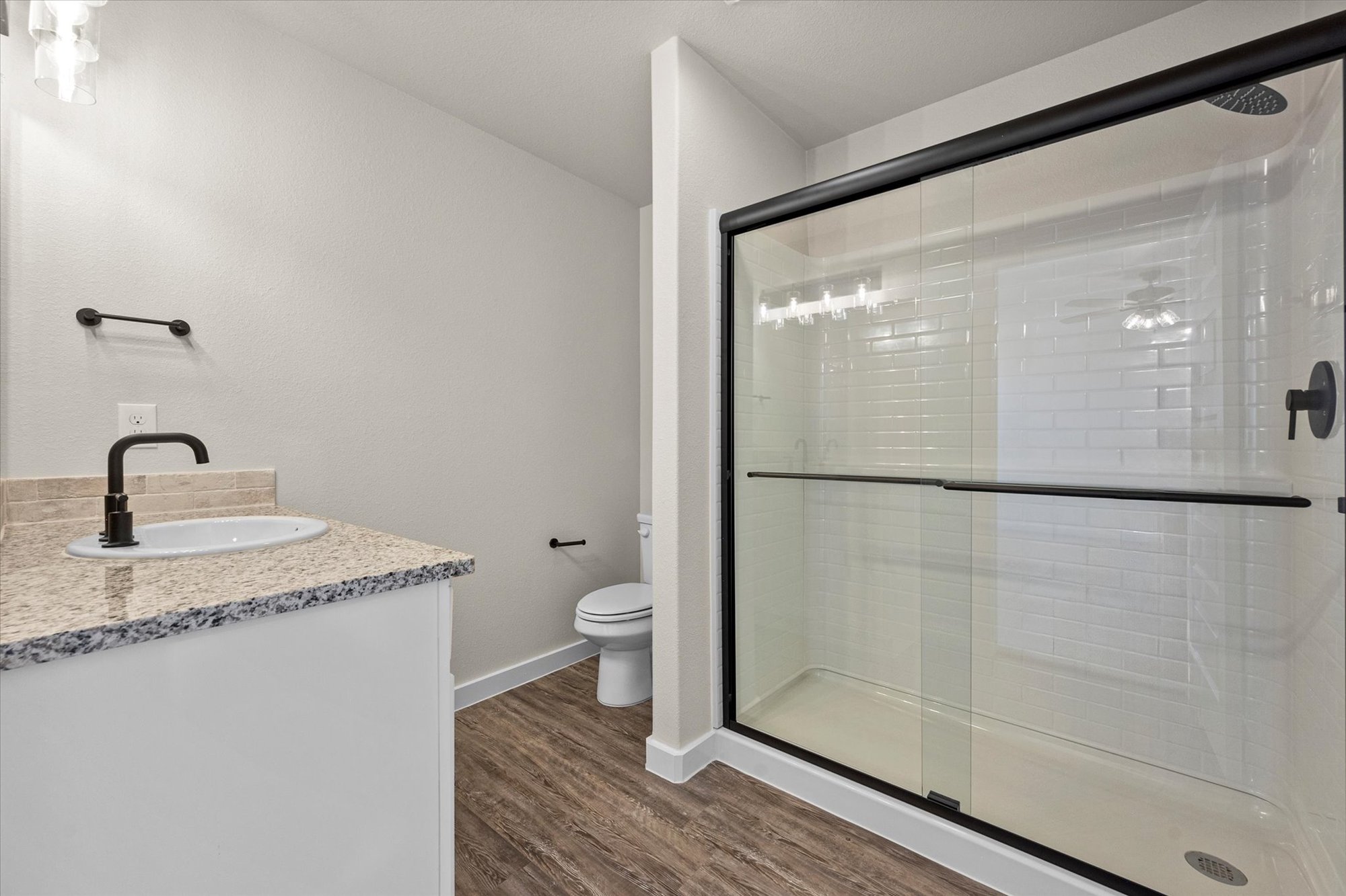 - Granite or quartz countertops throughout