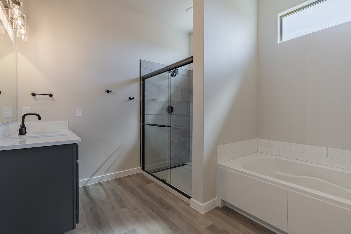 - Secluded master suite with garden tub, walk-in shower, his and hers vanities, and oversized walk-in closet