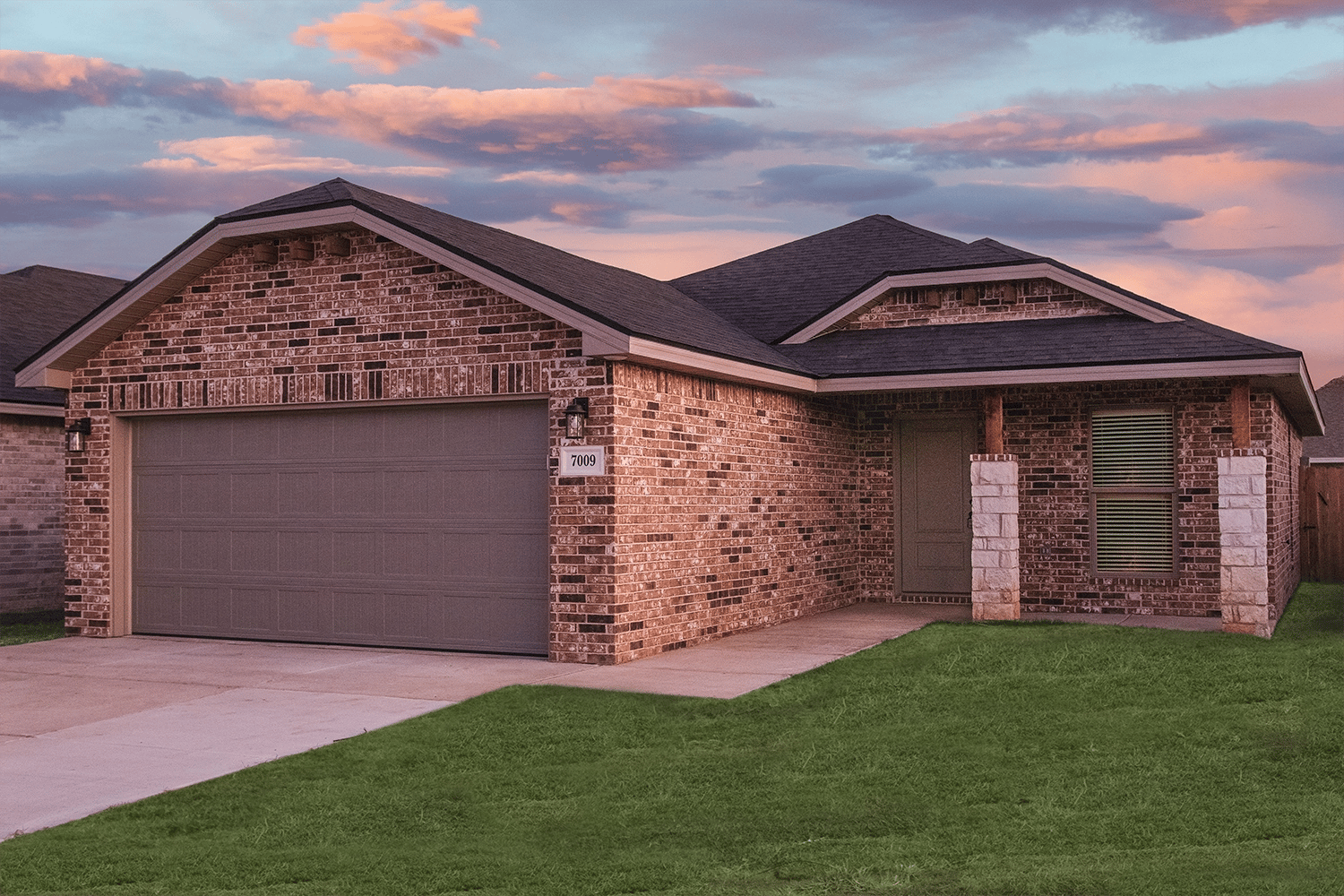 - Brick exterior accented by double columns framing the covered front porch