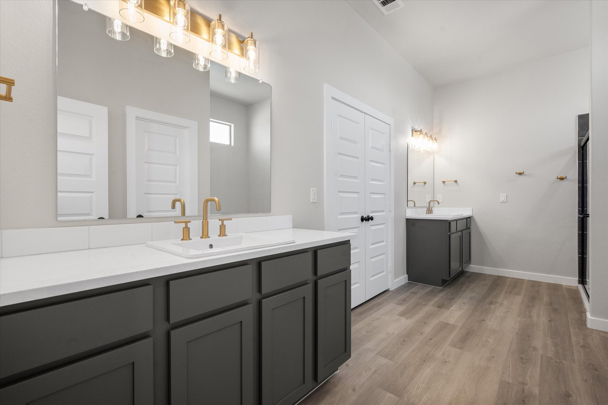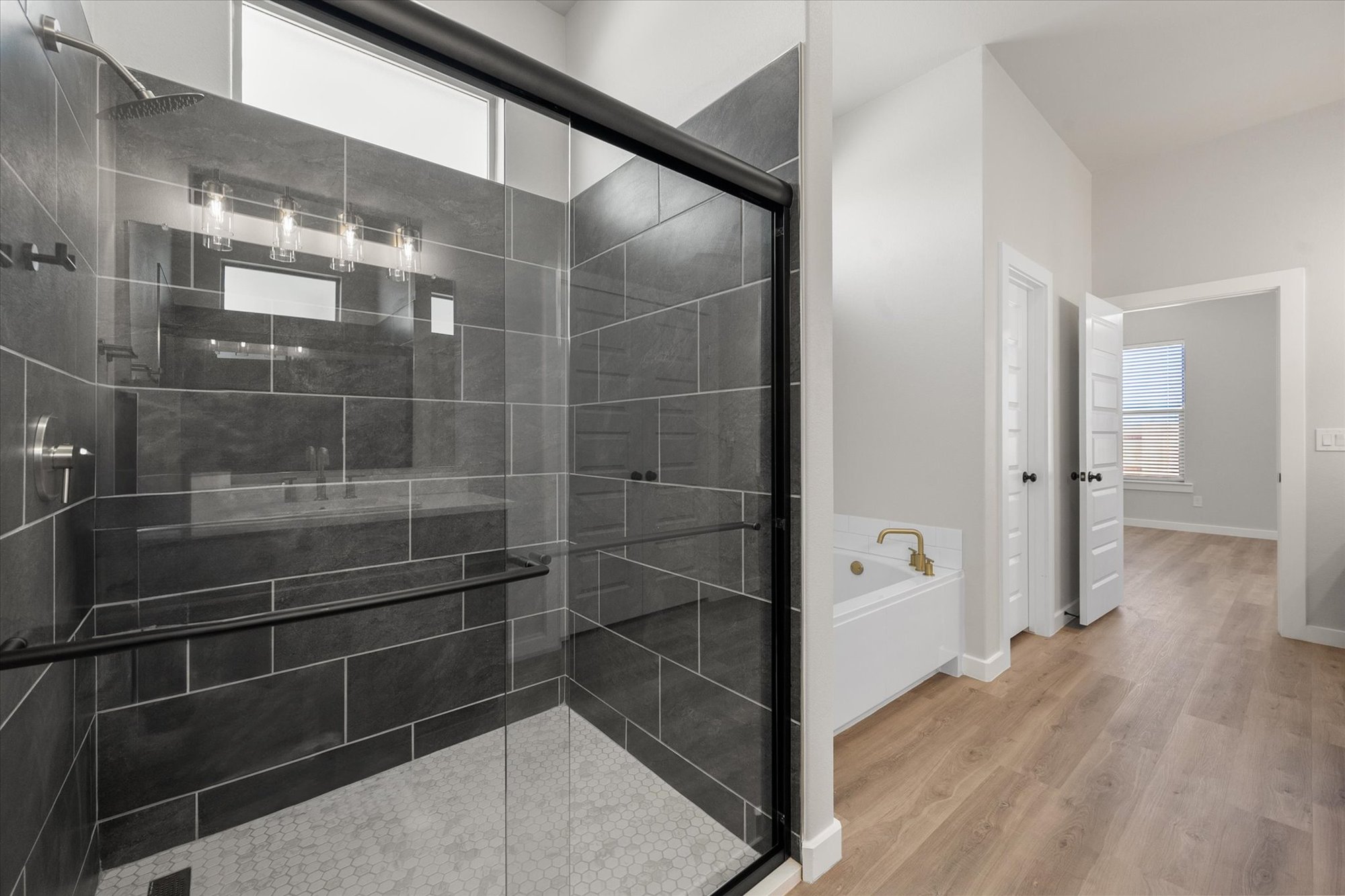 - Secluded master suite with garden tub, walk-in shower, his and hers vanities, and oversized walk-in closet