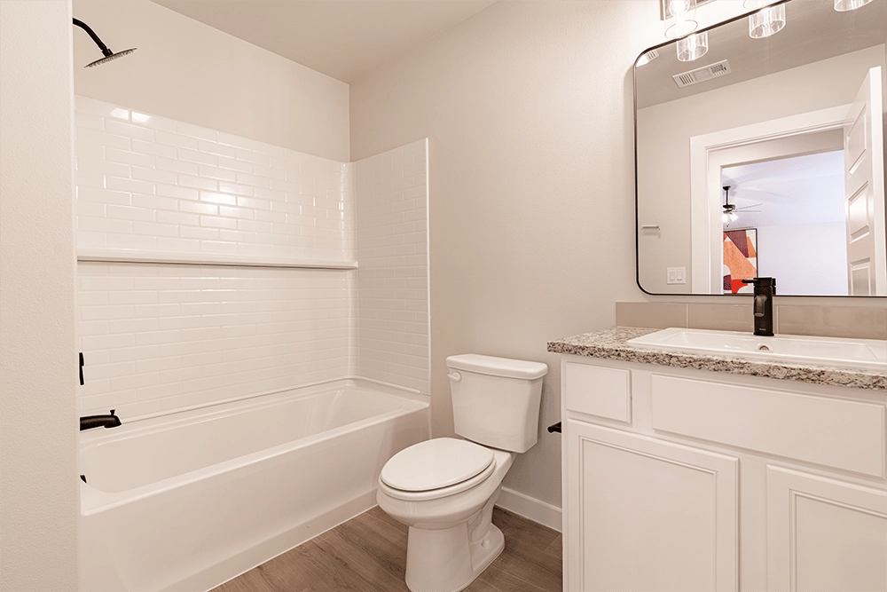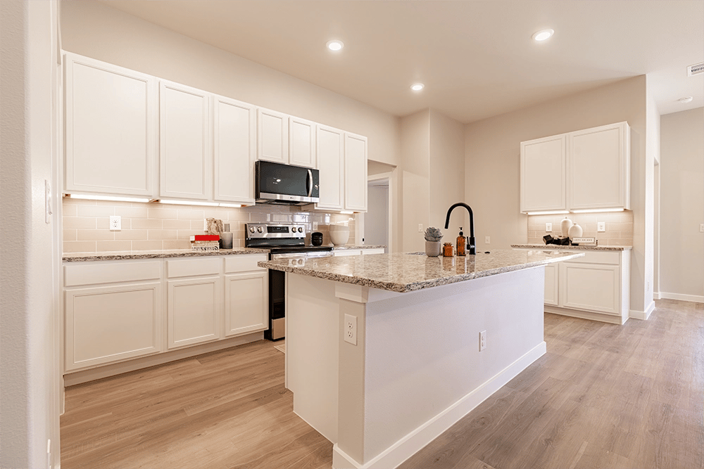 - Granite or quartz countertops throughout